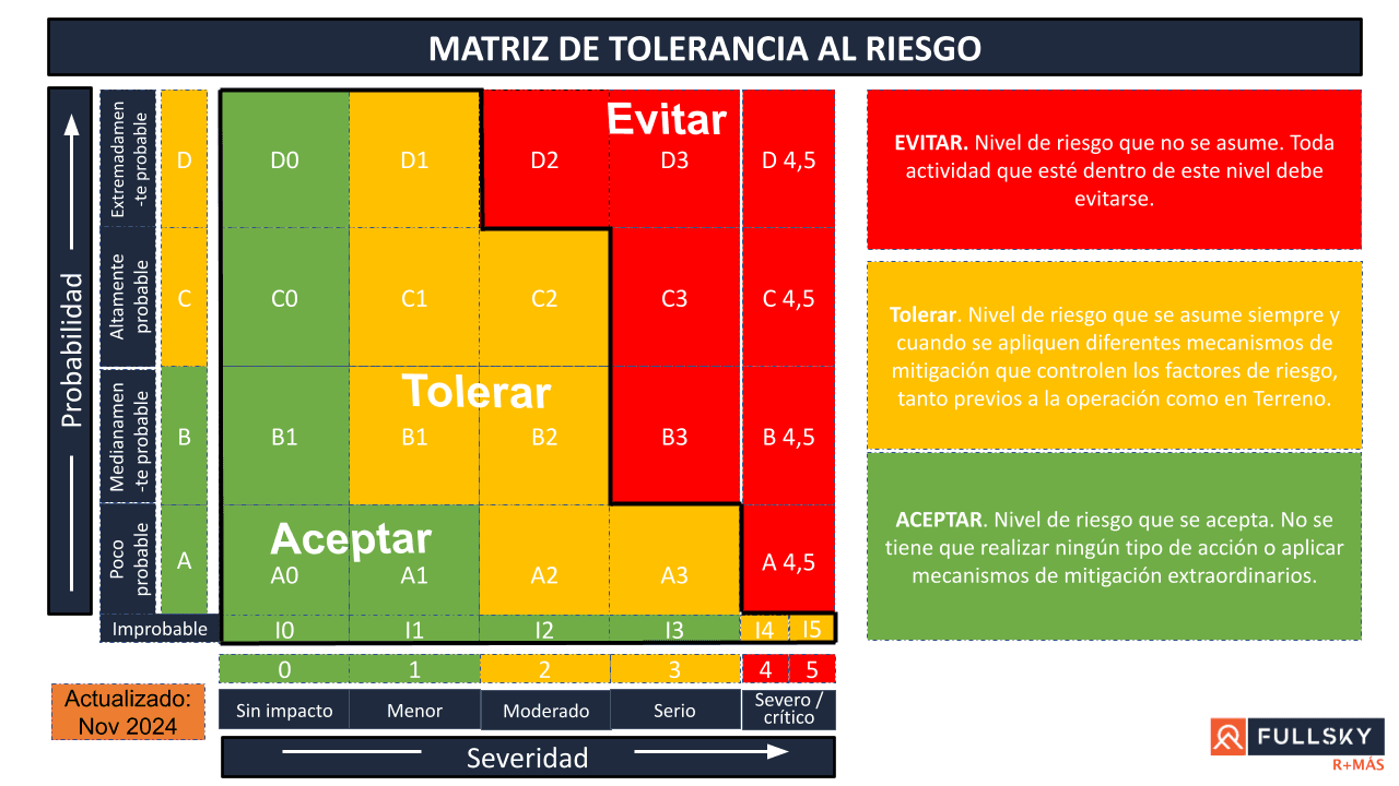 Zona amarilla, la franja que Fullsky considera tolerable: el espacio donde asumimos el riesgo y lo mitigamos. Aquí habita la experiencia transformadora; no es un lugar de complacencia sino de disciplina y de consciencia. Solo permanecemos en este territorio cuando hay mecanismos de mitigación para reducir la probabilidad de daños o perjuicios o sus consecuencias.